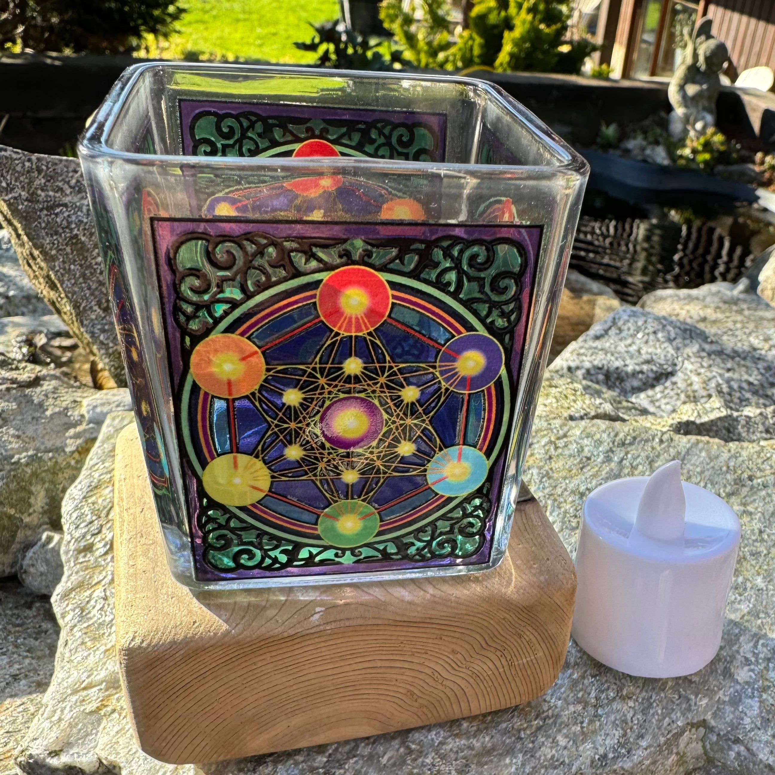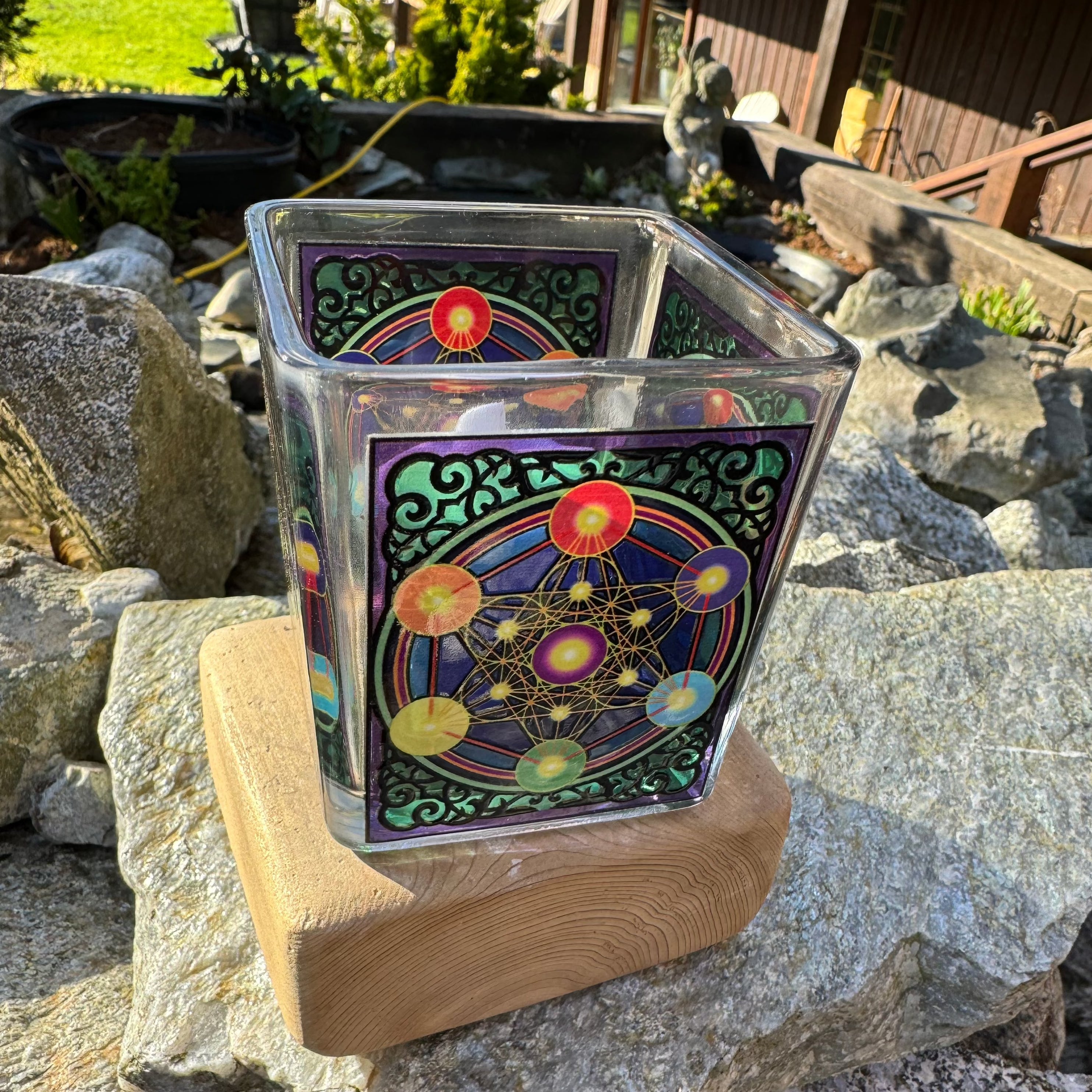 Handcrafted Glass Square Votive Candle Holder with LED Candle Bonus - Megatron Chakra #3 - Elegant Decor, Chakra Balancing