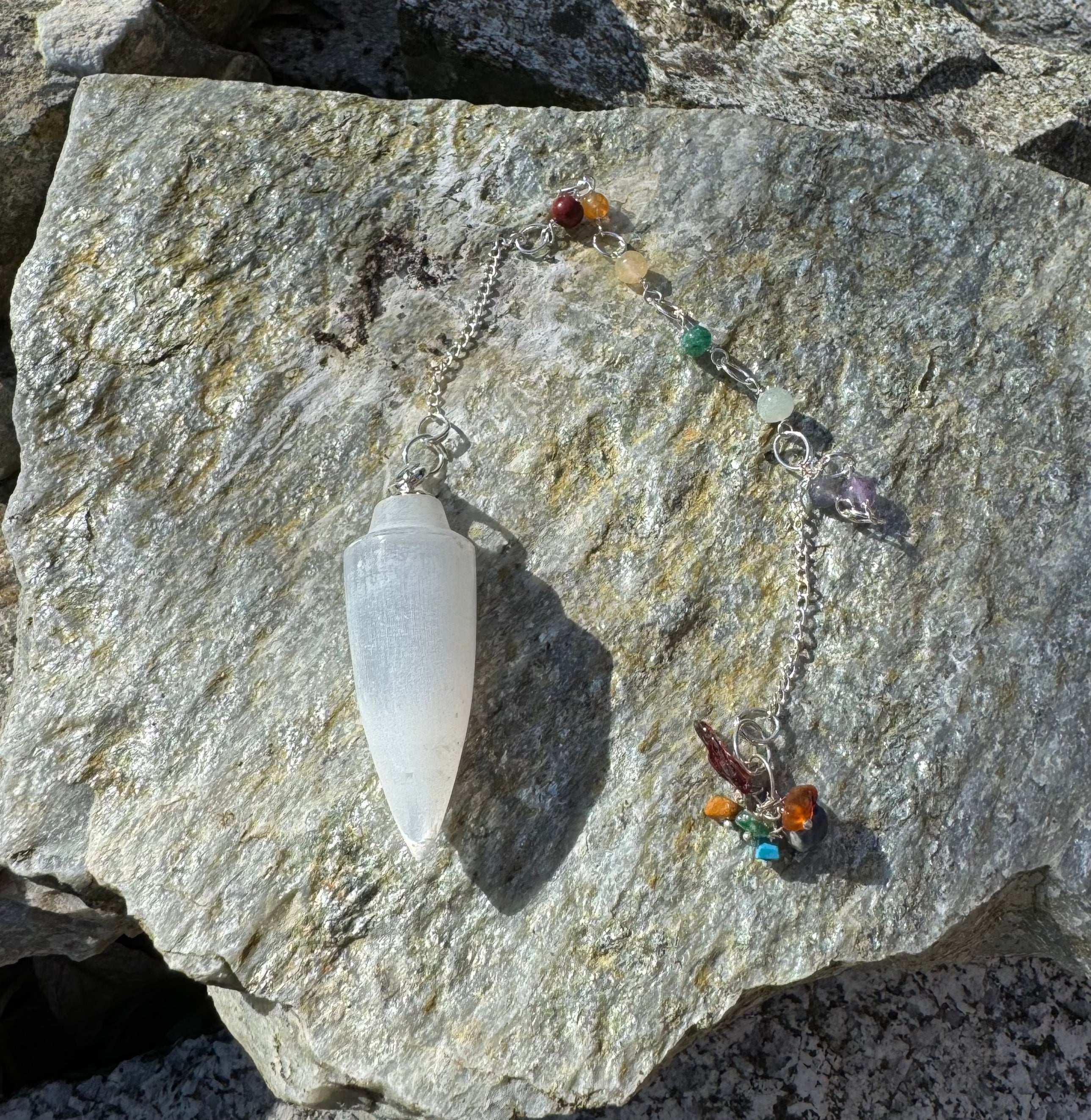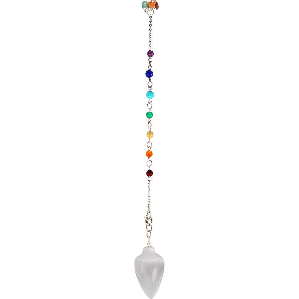 White Selenite Chakra Pendulum with Matching Chakra Stones on Chain - Divination Tool, Energy Healing, Spiritual Insight SEC01
