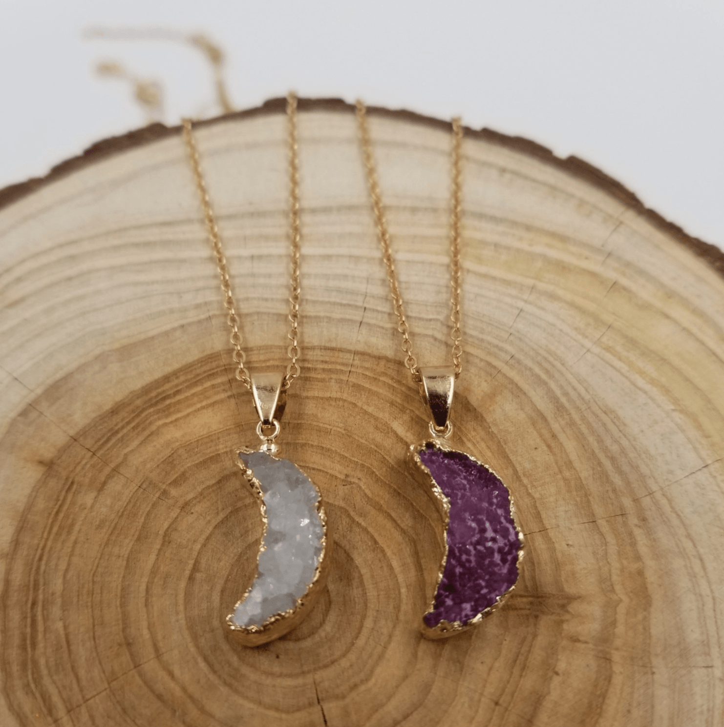 Enhance your elegance with our Gold Plated Natural Crystal Moon Pendant Necklace, featuring a treated amethyst stone. This exquisite Crystal Moon Pendant necklace showcases a beautifully crafted moon pendant, symbolizing intuition and serenity, paired with the rich purple hues of amethyst. Known for its calming and spiritual properties, this necklace adds a touch of luxury and positive energy to any outfit. Perfect for any occasion, it makes a thoughtful and meaningful gift for those who appreciate unique and beautiful jewelry.