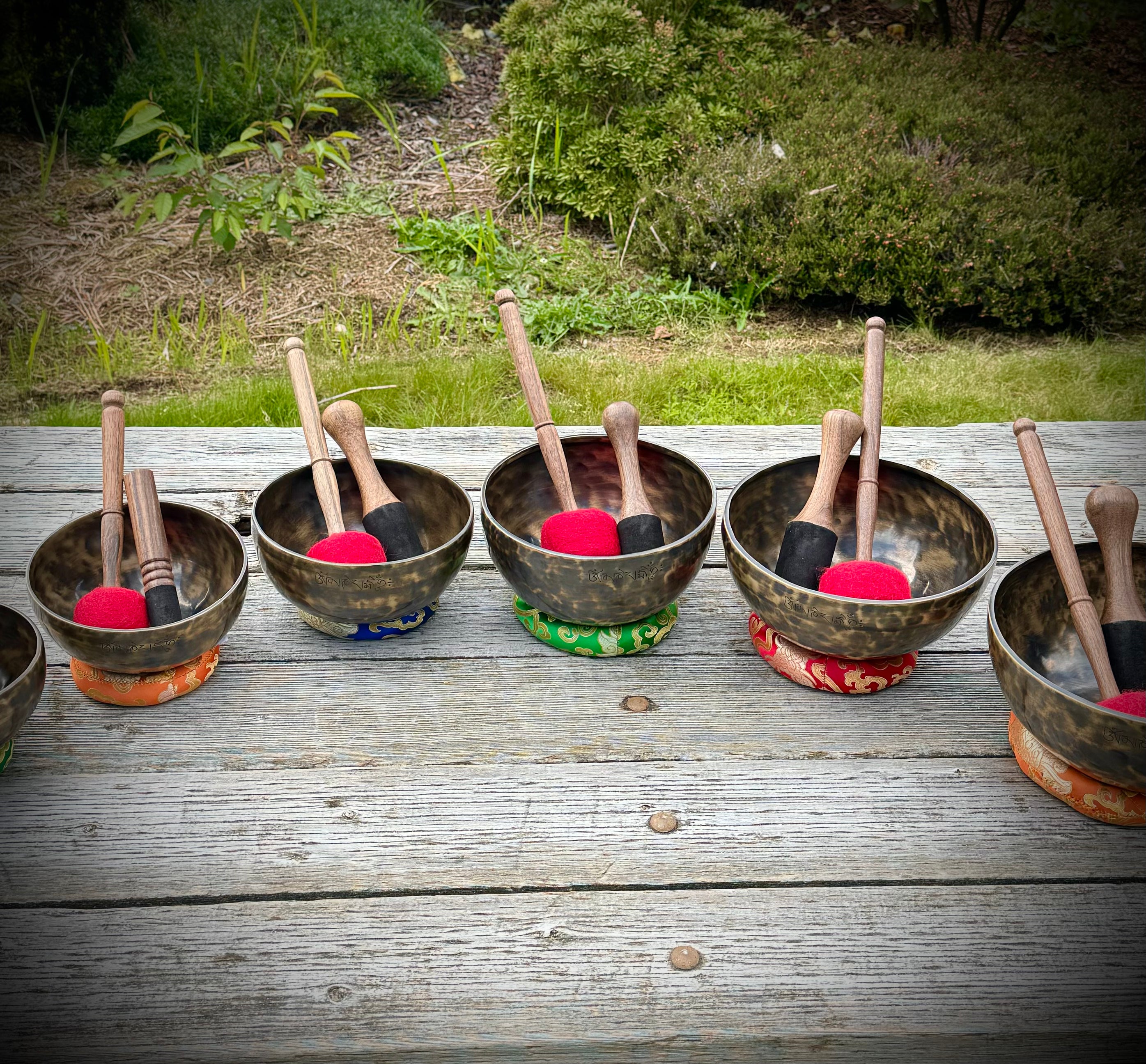 Individually sized Rosewood Mallets, Strikers, and Pillows for each bowl. This particular unique set includes the following.