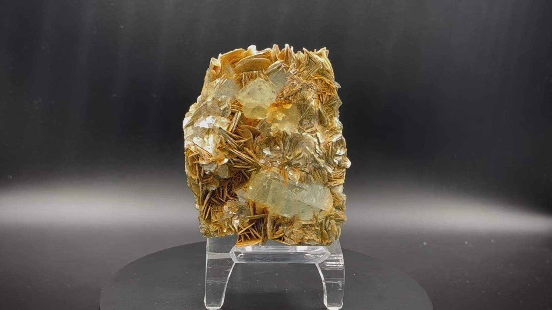 441 grammes, 6,5 cm de large, 5 cm de long, 5 cm de haut. Magnifique spécimen avec plusieurs petits points clairs et un gros, et de grandes formations de mica définies.