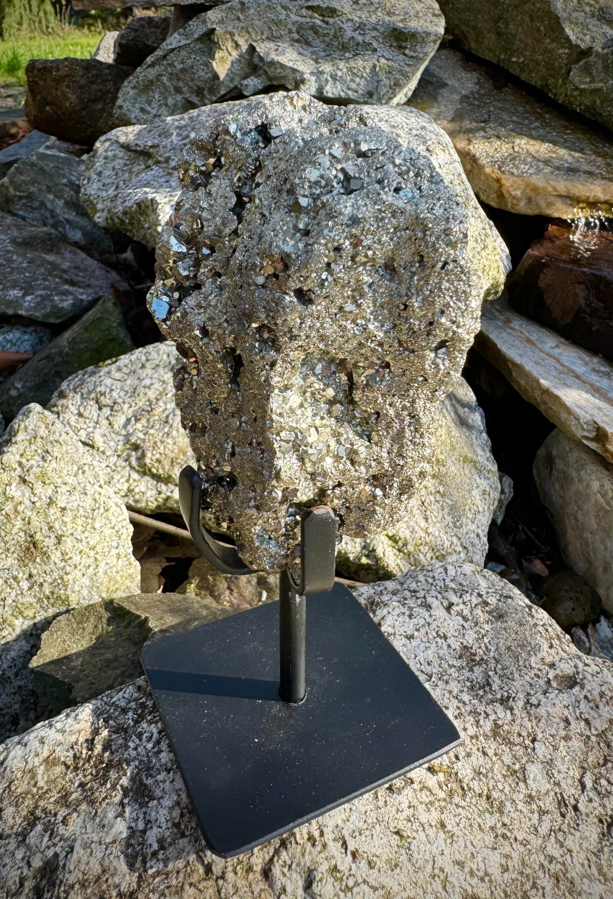 Élevez votre collection avec ce superbe spécimen de pyrite brésilienne sur support. Pesant 1,15 kg, cette pièce de qualité super extra A+++ est un ajout unique et fascinant à l’exposition de tout amateur de minéraux.