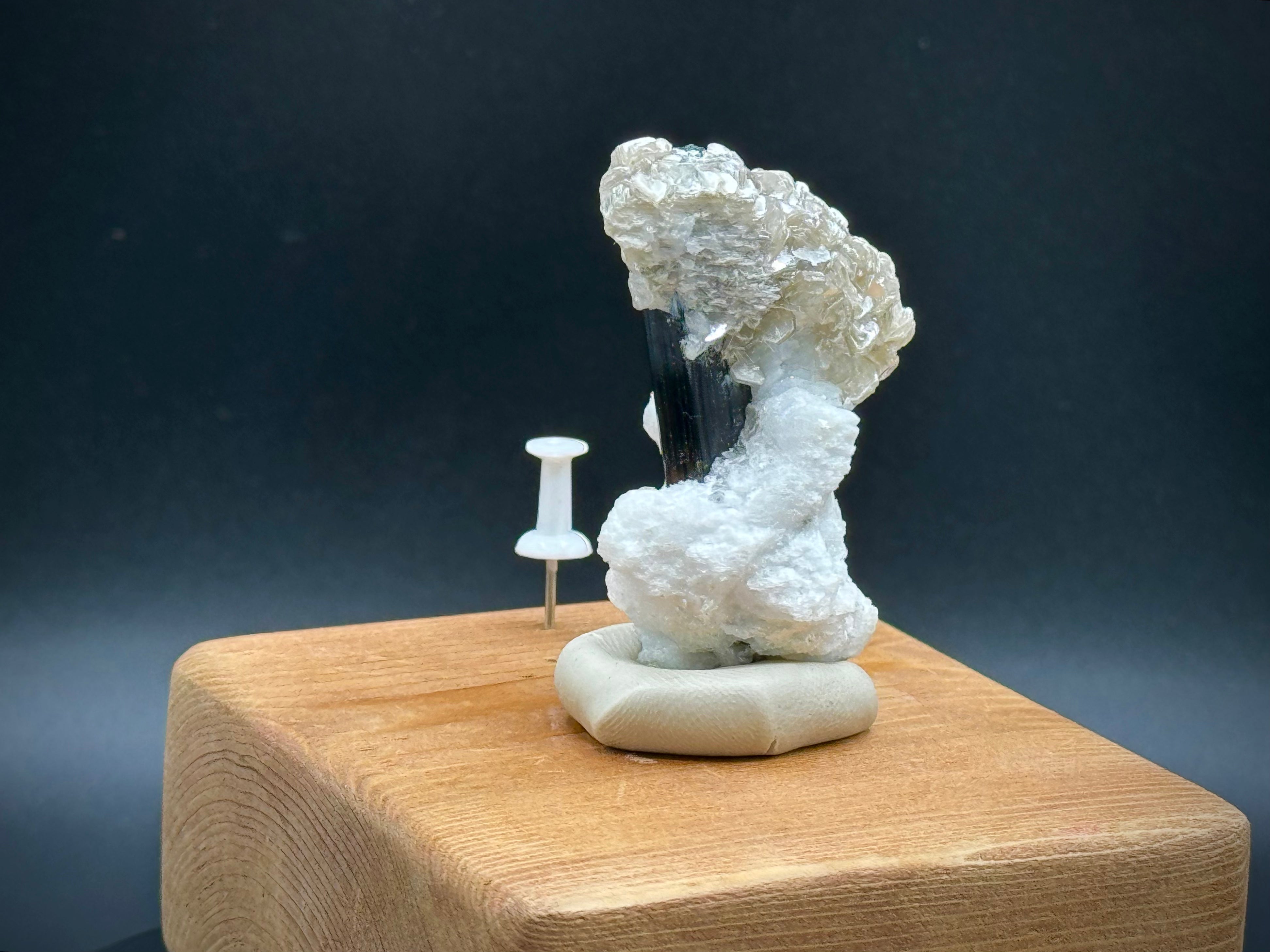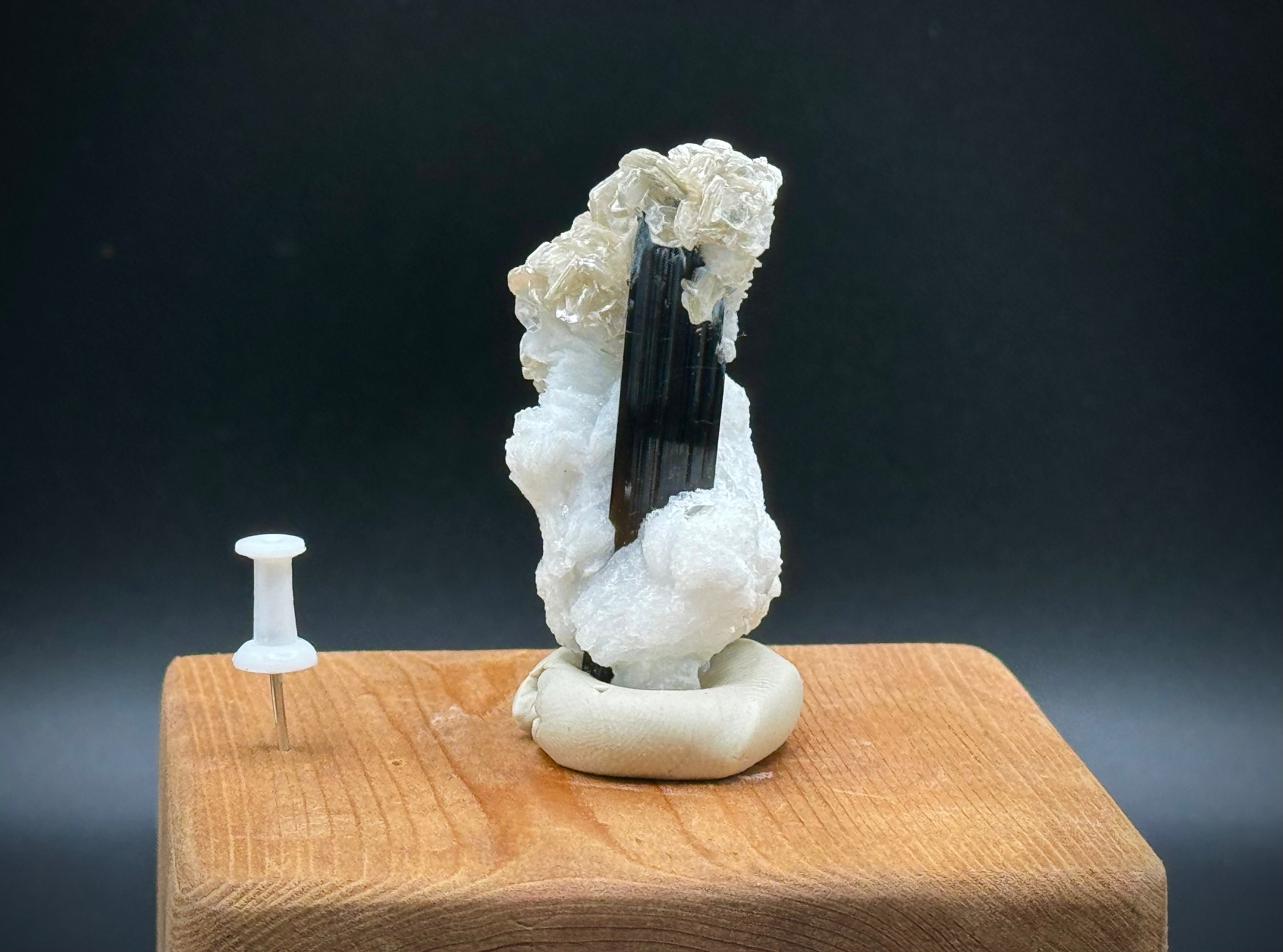 36 grammes, 5,5 cm de long, 3,75 cm de large. Grand spécimen avec une plus grande lame centrale de tourmaline avec du mica à une extrémité et du feldspath à l'autre.