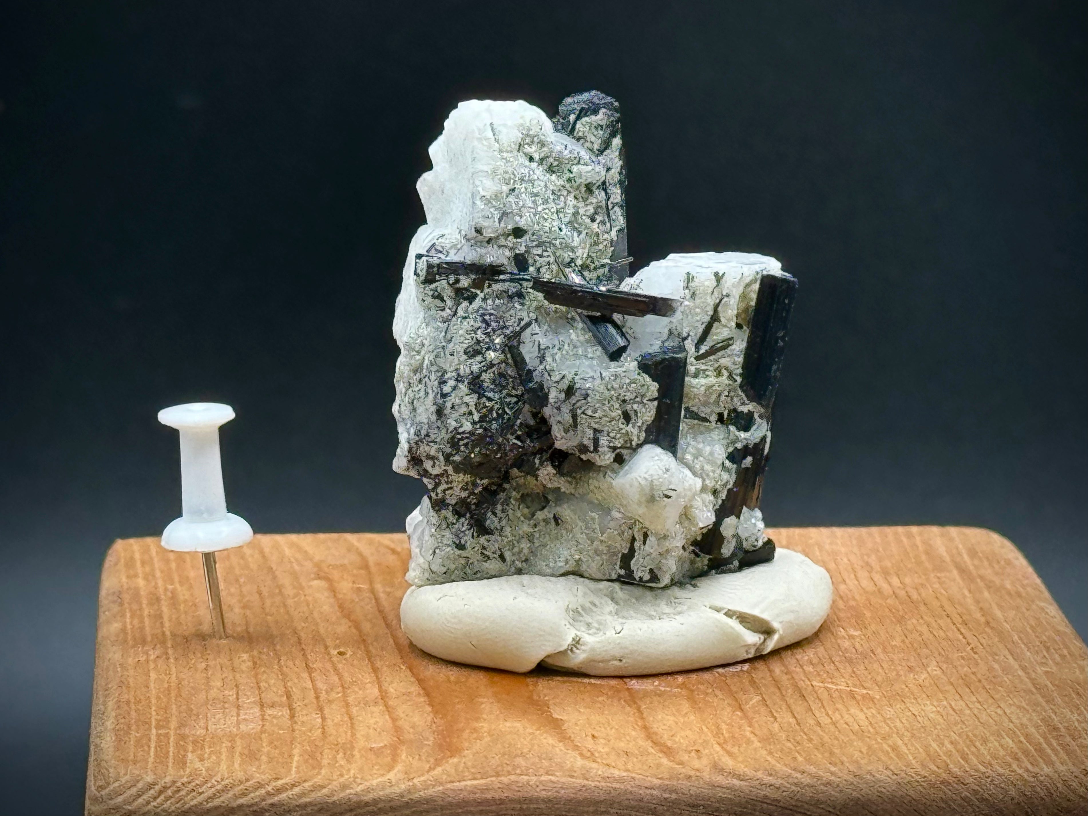 47,1 grammes, 4,75 cm de long, 4 cm de large. Grand spécimen avec du feldspath et de multiples lames de tourmaline. Beau!