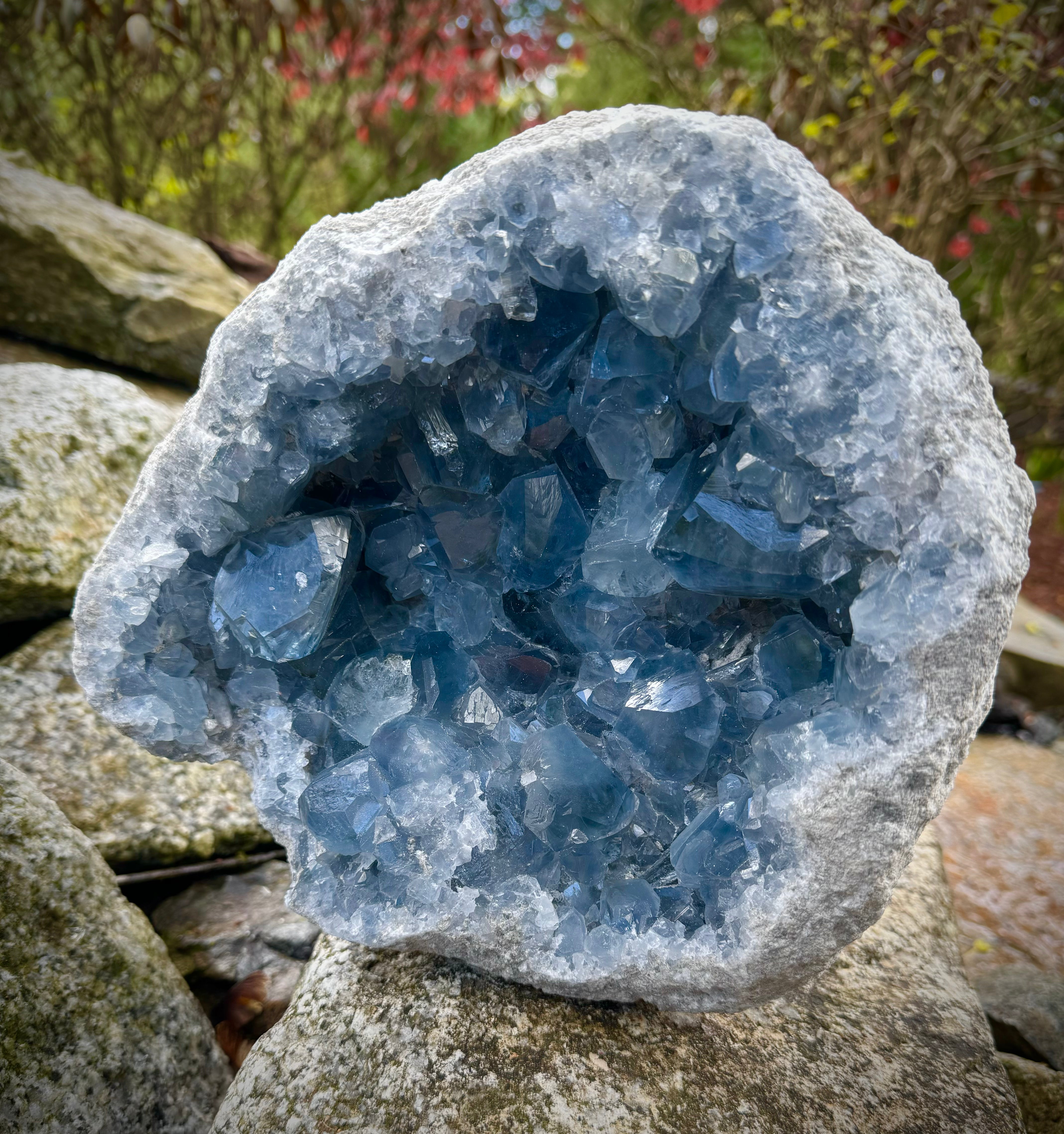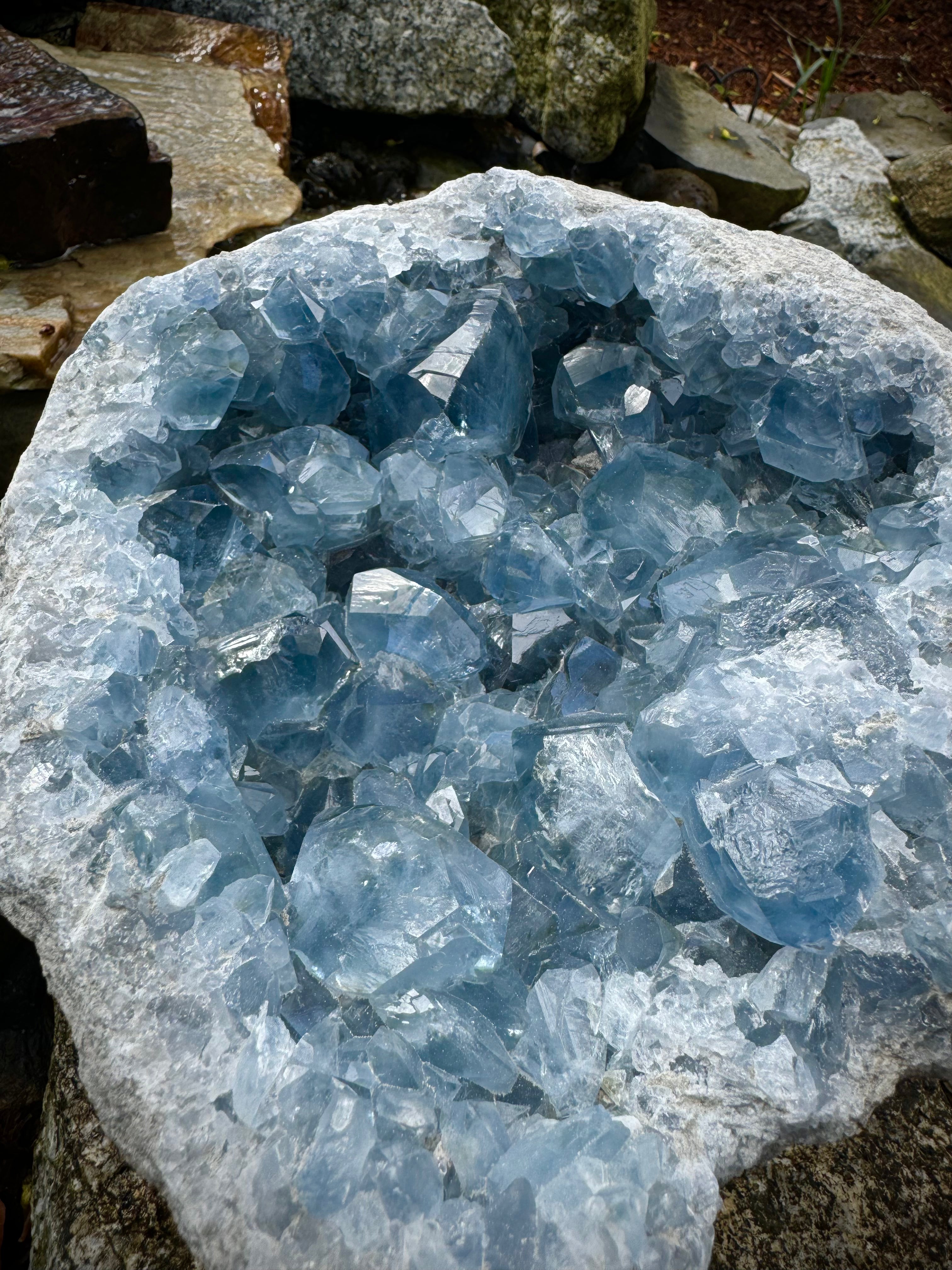 • Célestite naturelle : Ce spécimen XXXL présente de gros cubes clairs et gemmes de la plus haute qualité.